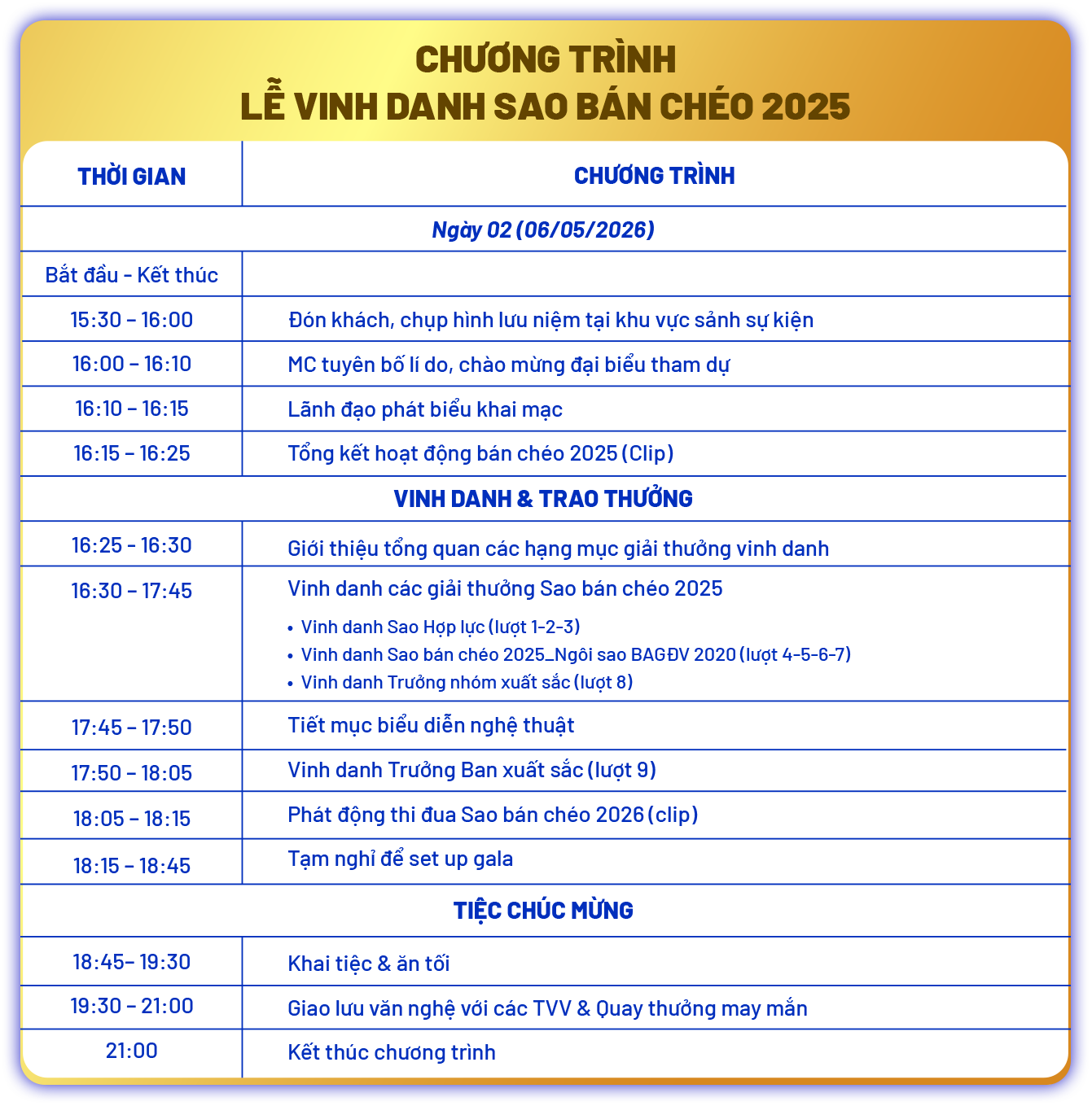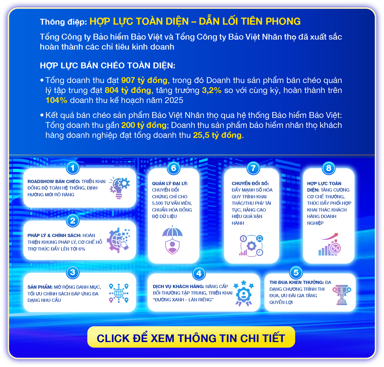 Sự kiện vinh danh lớn nhất năm được tổ chức thường niên nhằm ghi nhận và tôn vinh các cá nhân, tập thể xuất sắc trong hoạt động bán chéo, đồng thời lan tỏa tinh thần hợp lực trong toàn hệ thống. Chương trình đánh dấu một chặng đường phát triển quan trọng, hướng tới giai đoạn hợp lực toàn diện và bền vững hơn.
